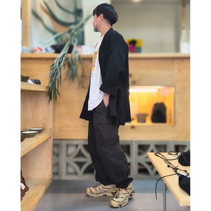 ライトジャケットの感覚で羽織れる、コットン100%の12ozブラックデニム作務衣です。