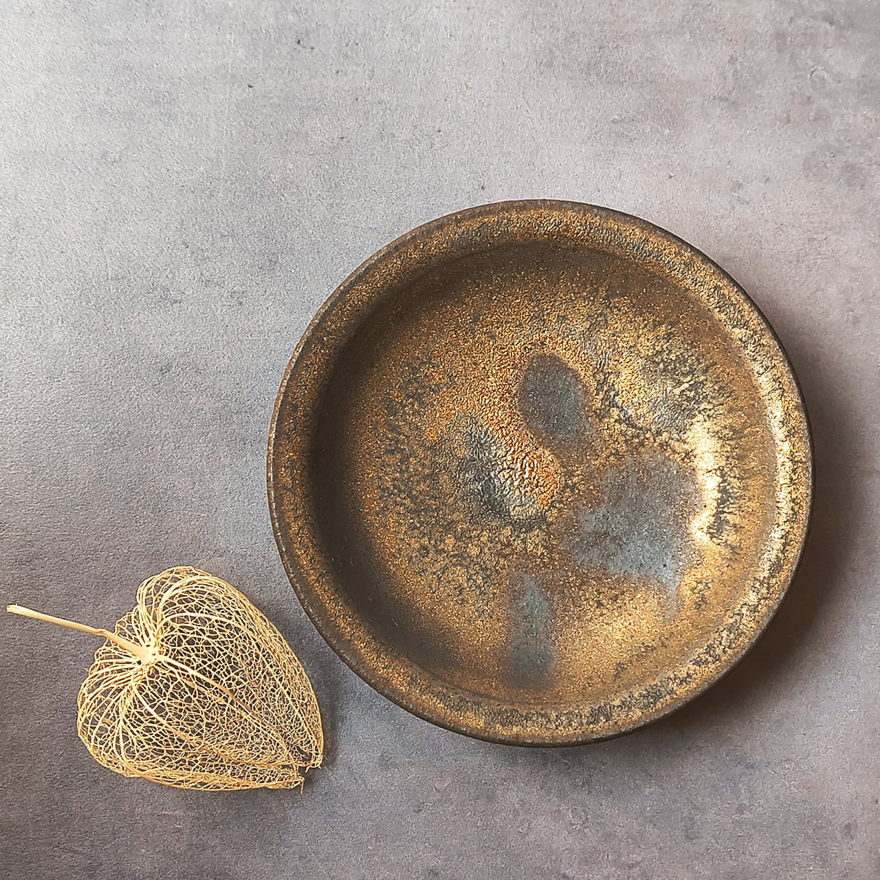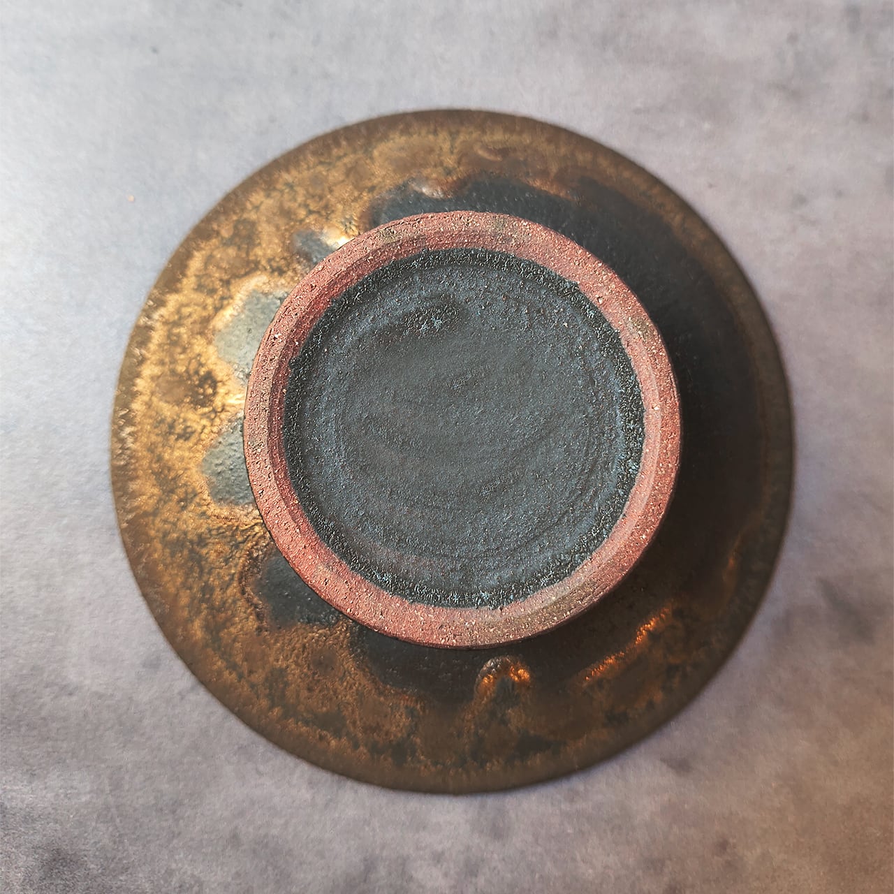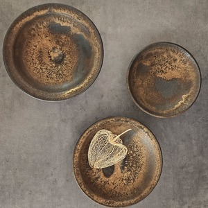 FUCLAY blackの釉薬(部分的に金色が出ている釉薬)を使用している器に関して、お酢やレモンなど酸性の強いものを長時間放置すると変色する事がありますので、ご注意ください。