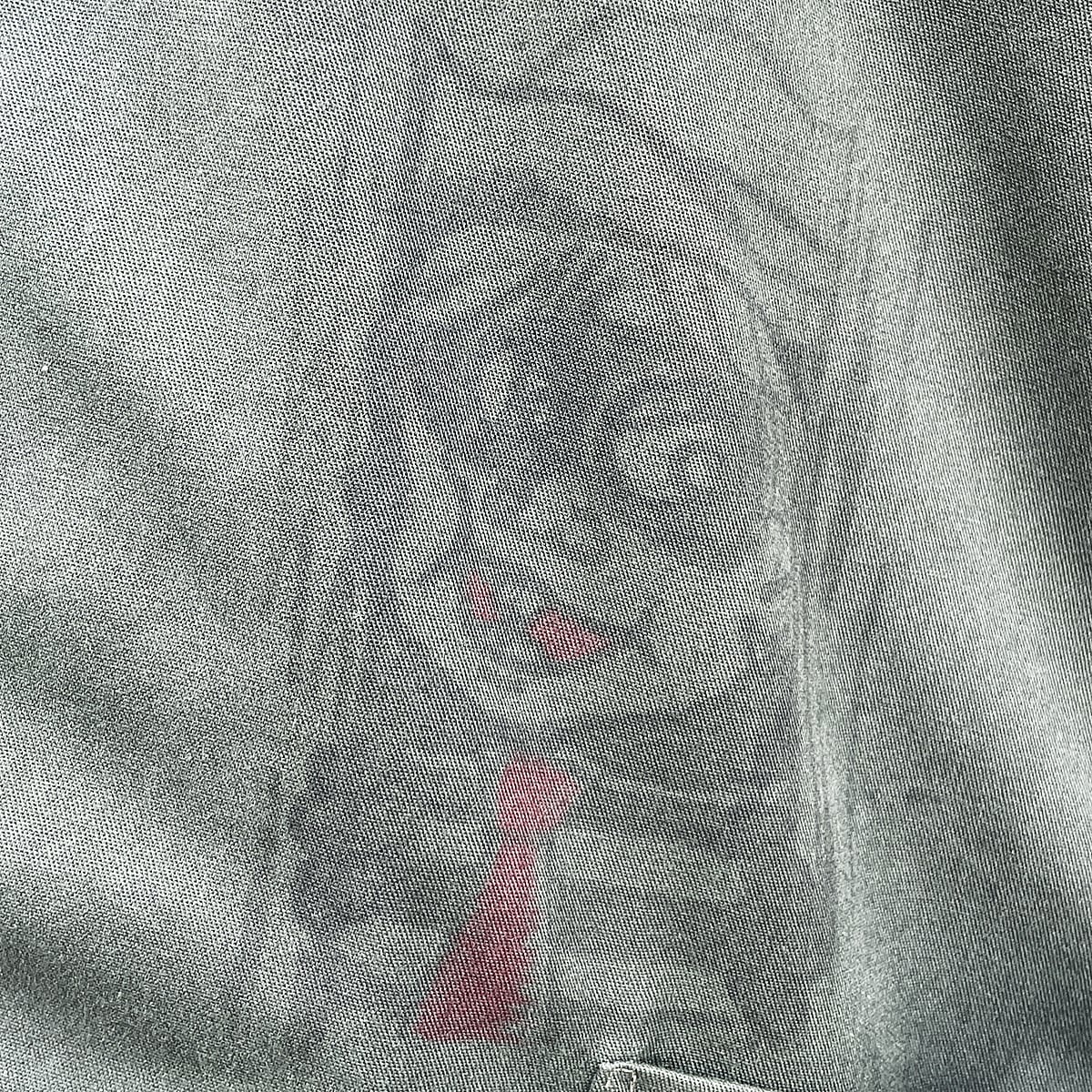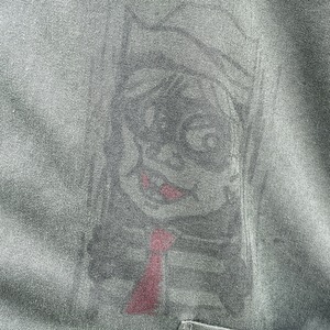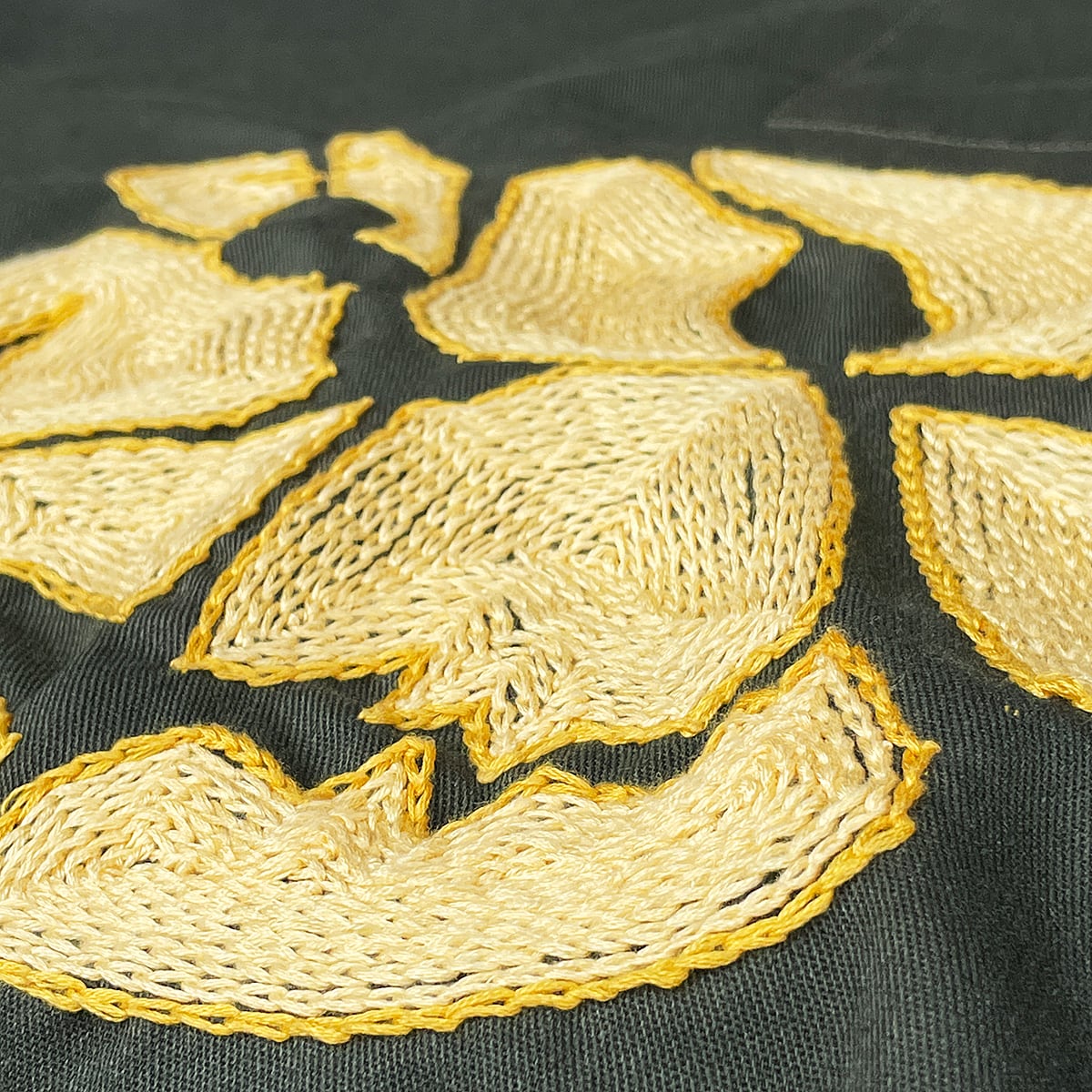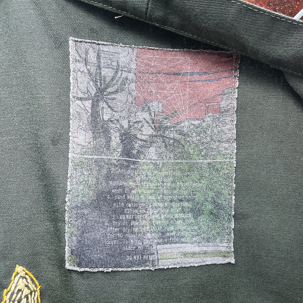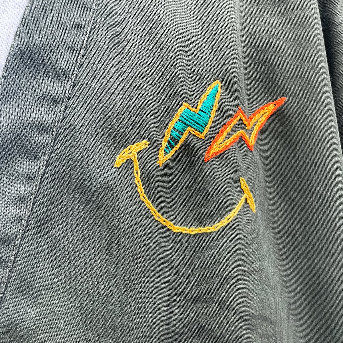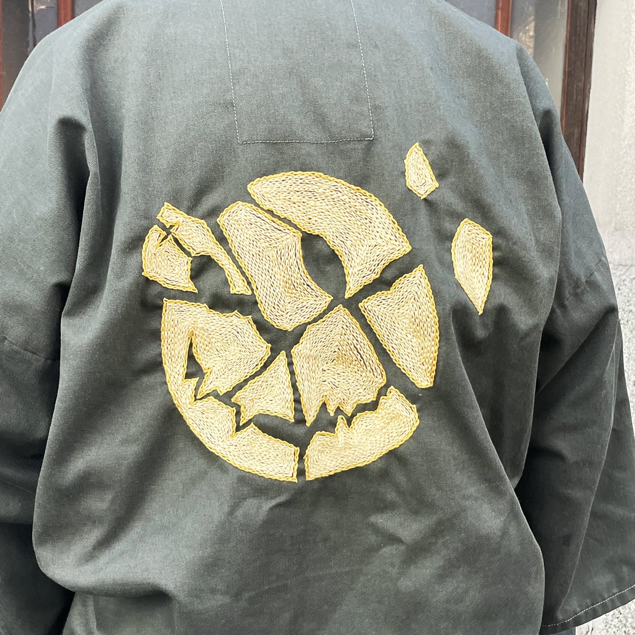 背中には幸潤商店定番のベルリンパンクの刺繍。この刺繍は、ベルリン崩壊時にパンクスが来ていたTシャツの柄をオマージュ。左胸にもポップな刺繍あり。