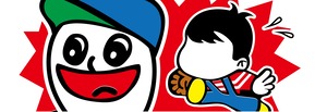 のっぺらぼうのマー坊と、顔から飛び出したフテン君。「飛び出しすぎ坊や」のミニ巾着。