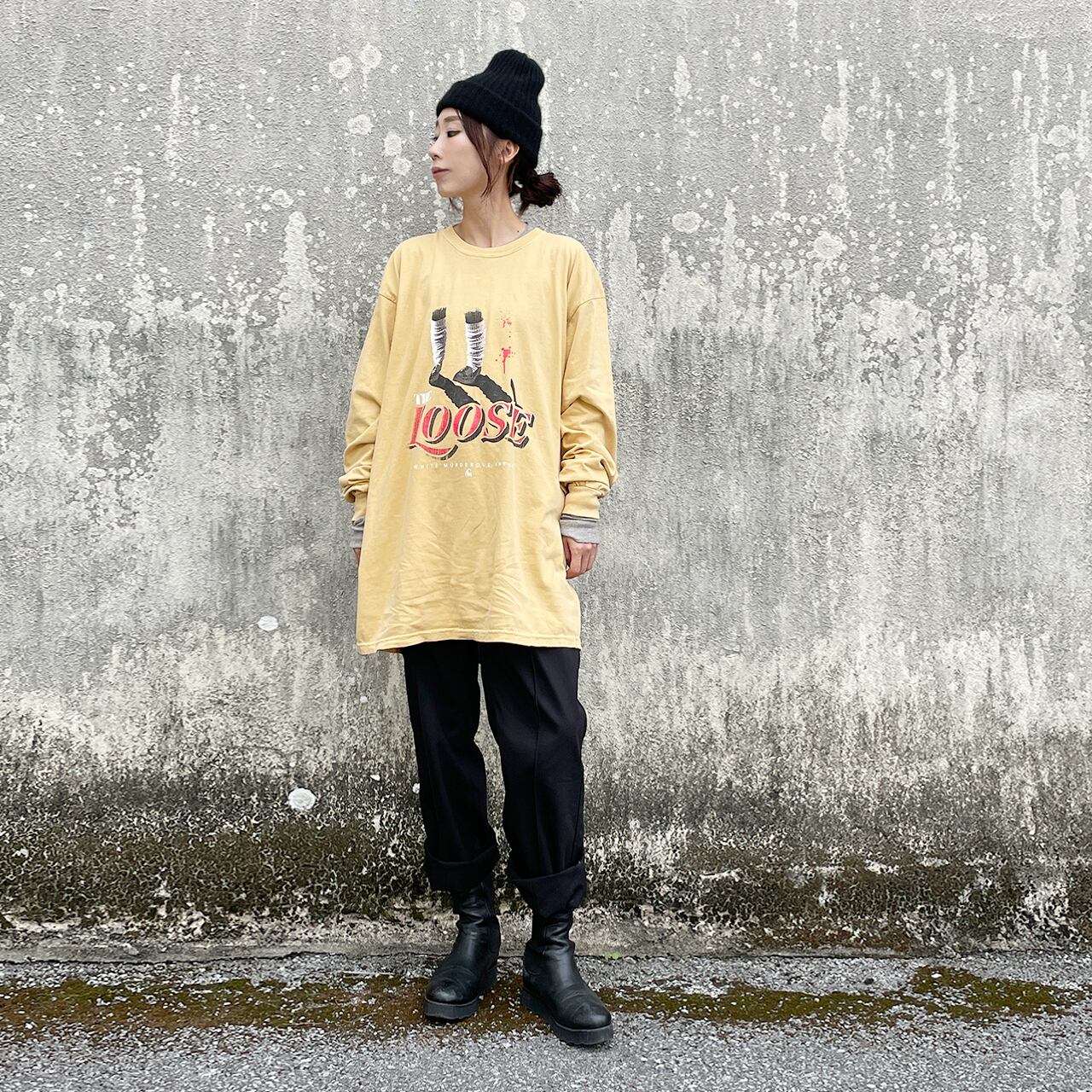ヴィンテージプリント加工 90'sギャルをホラーテイストにしたロングTシャツです。