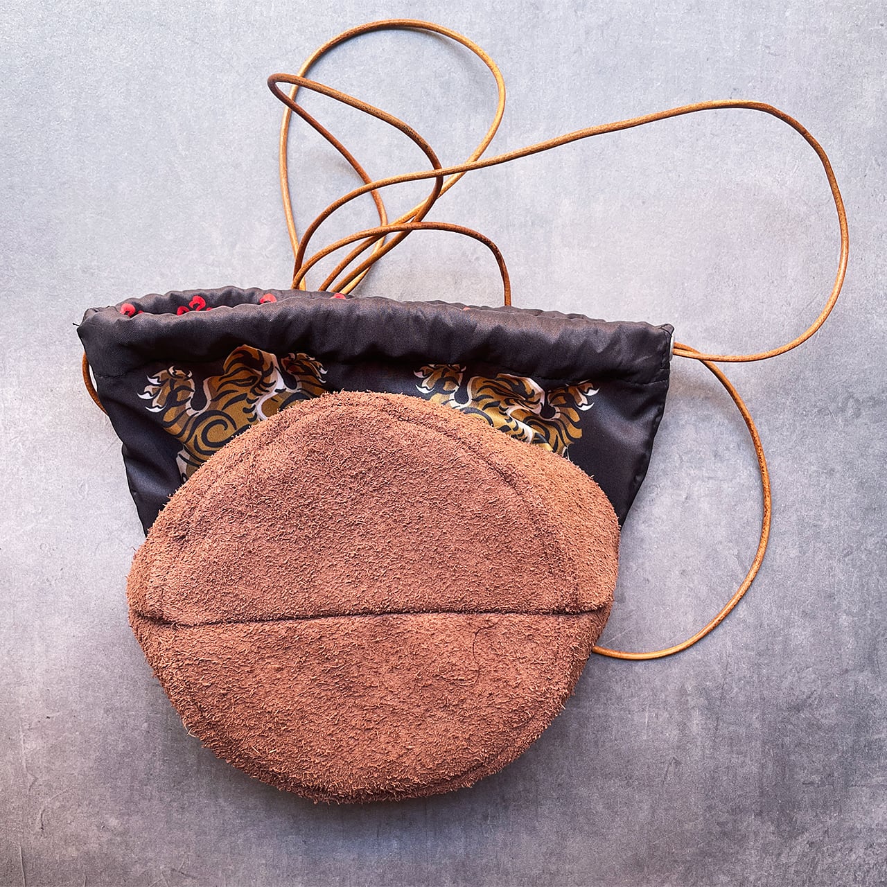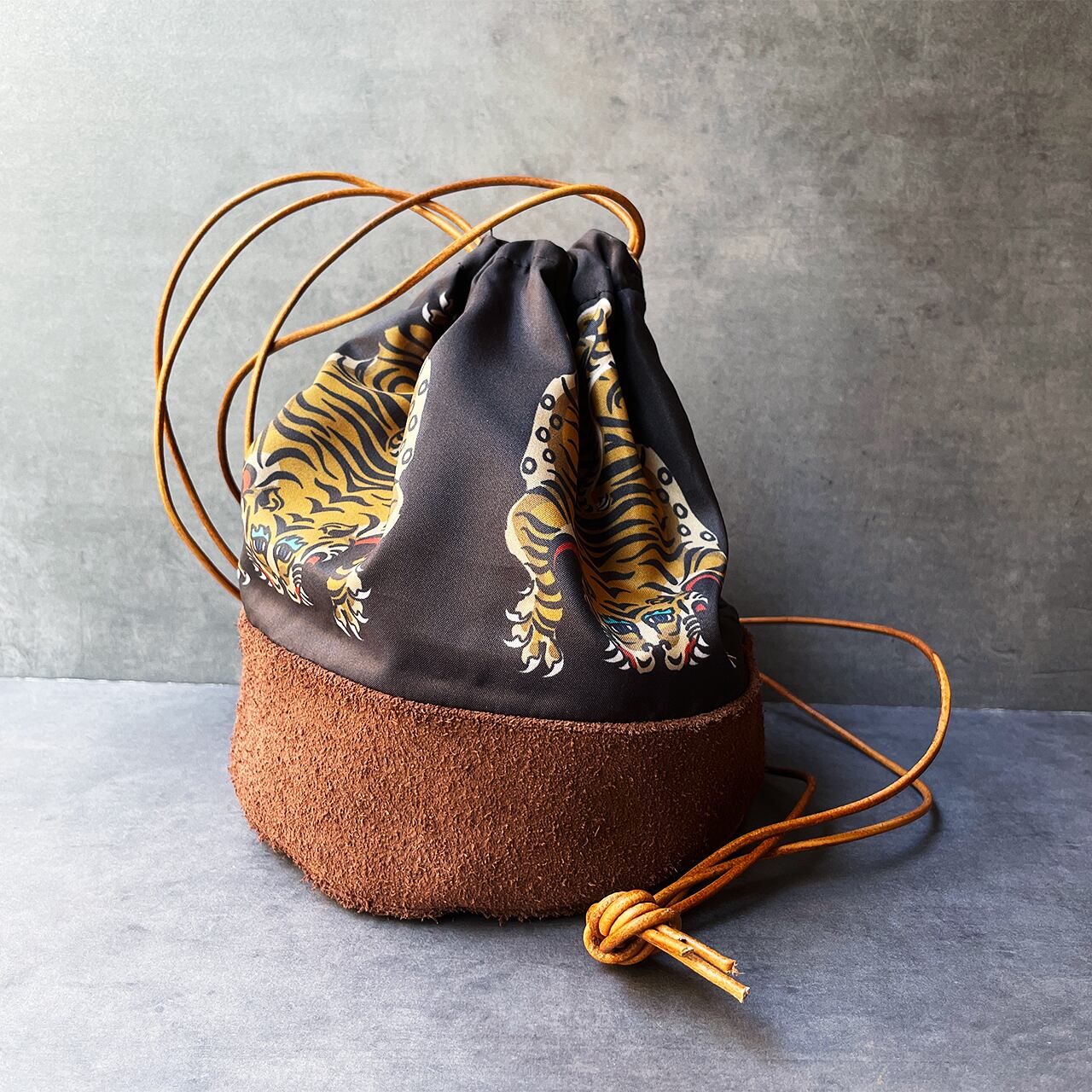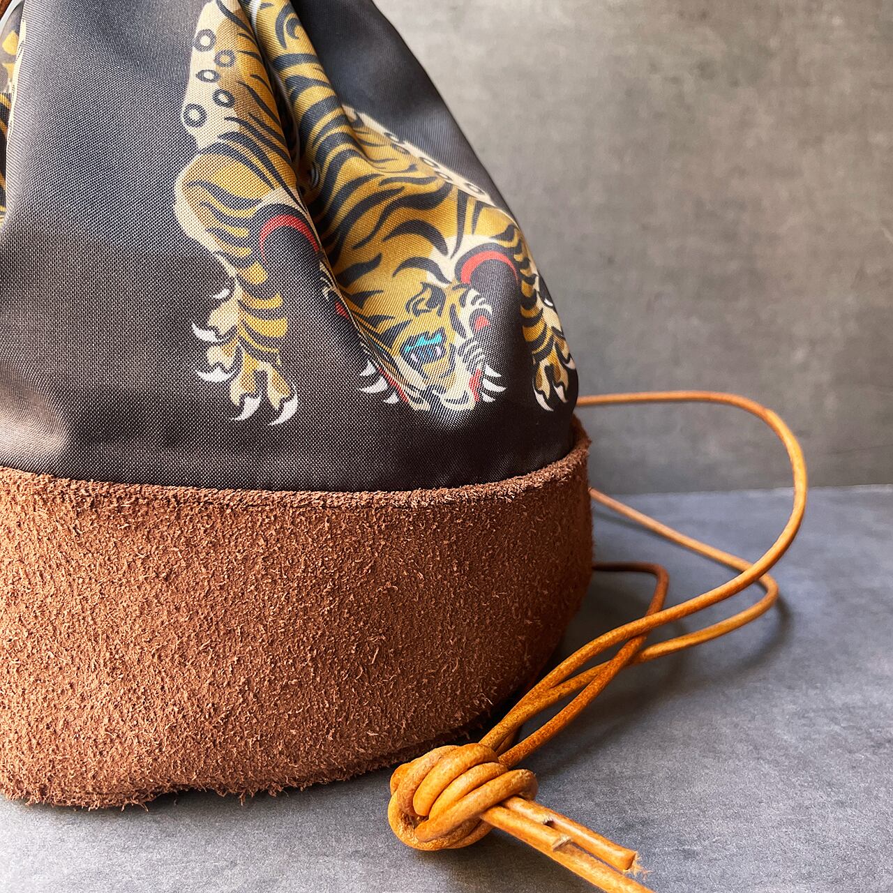 底は牛の床革、紐は牛革で、実はこだわりのあるちょっと大人な巾着。