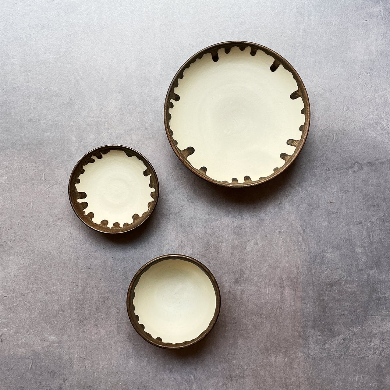 FUCLAY blackの釉薬(部分的に金色が出ている釉薬)を使用している器に関して、お酢やレモンなど酸性の強いものを長時間放置すると変色する事がありますので、ご注意ください。