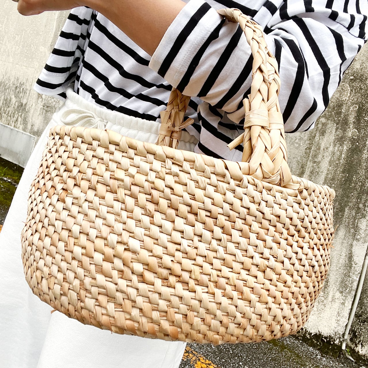 パンやワインを入れて、お天気の良い日に出かけたくなるような、丁寧で温かみを感じるカゴバッグ。また、生地を入れたり、雑貨を入れたりして、インテリアとしても楽しめます。